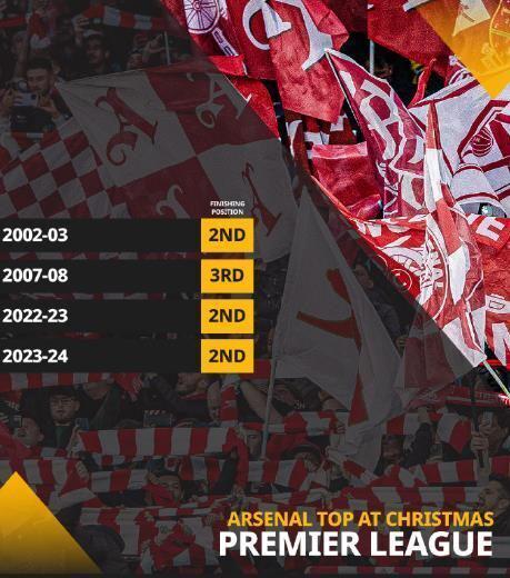 回顧阿森納的圣誕冠軍歷史,槍手球迷全都“瑟瑟發(fā)抖”。2002/03賽季,阿森納首度拿到圣誕冠軍 ,最終收獲那個(gè)賽季的英超亞軍;2007/08賽季,阿森納第二次拿到圣誕冠軍 ,結(jié)果最終以英超季軍結(jié)束征程;2022/23賽季,阿森納第三次拿到圣誕冠軍,又一次以英超亞軍結(jié)束征程;2023/24賽季,阿森納第四次收獲圣誕冠軍,無奈最終又是以英超亞軍收尾。阿森納此前四次獲得英超“圣誕冠軍”,最終均無緣英超冠軍獎(jiǎng)杯。本賽季,槍手又一次拿下圣誕冠軍,這一次阿森納能否打破魔咒,現(xiàn)在來看還是需要畫上一個(gè)問號(hào)。