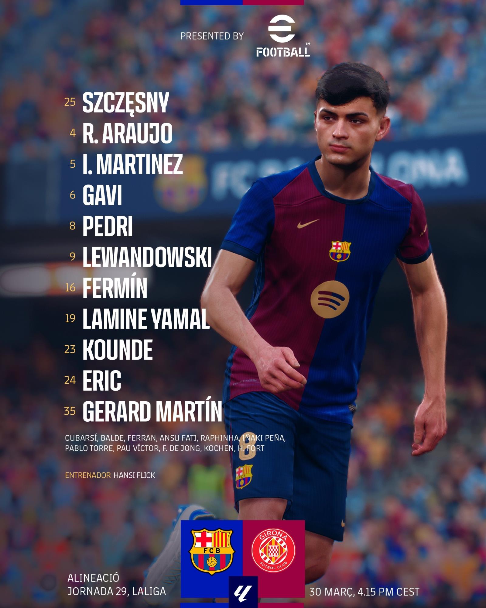 巴薩首發(fā):25-什琴斯尼、4-阿勞霍、5-伊尼戈-馬丁內(nèi)斯、23-孔德、24-埃里克-加西亞、35-杰拉德-馬丁、6-加維、8-佩德里、16-費(fèi)爾明、19-亞馬爾、9-萊萬